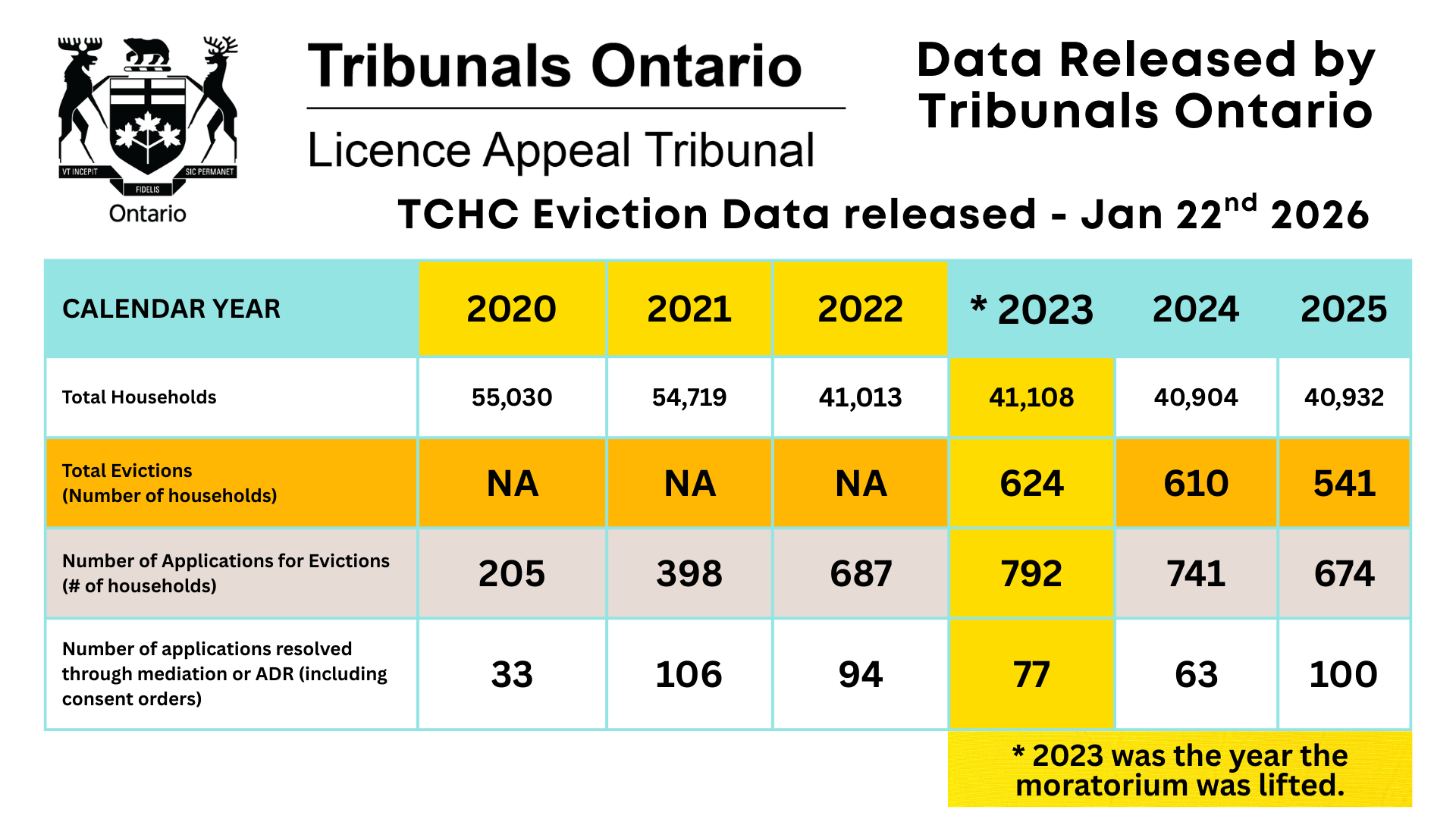 This analysis is based on data obtained through FIPPA Disclosure LTB-25-033-F (Access Decision dated January 22, 2026), alongside publicly reported figures. It identifies significant trends and reporting discrepancies in eviction data affecting Toronto Community Housing Corporation (TCHC) tenants.